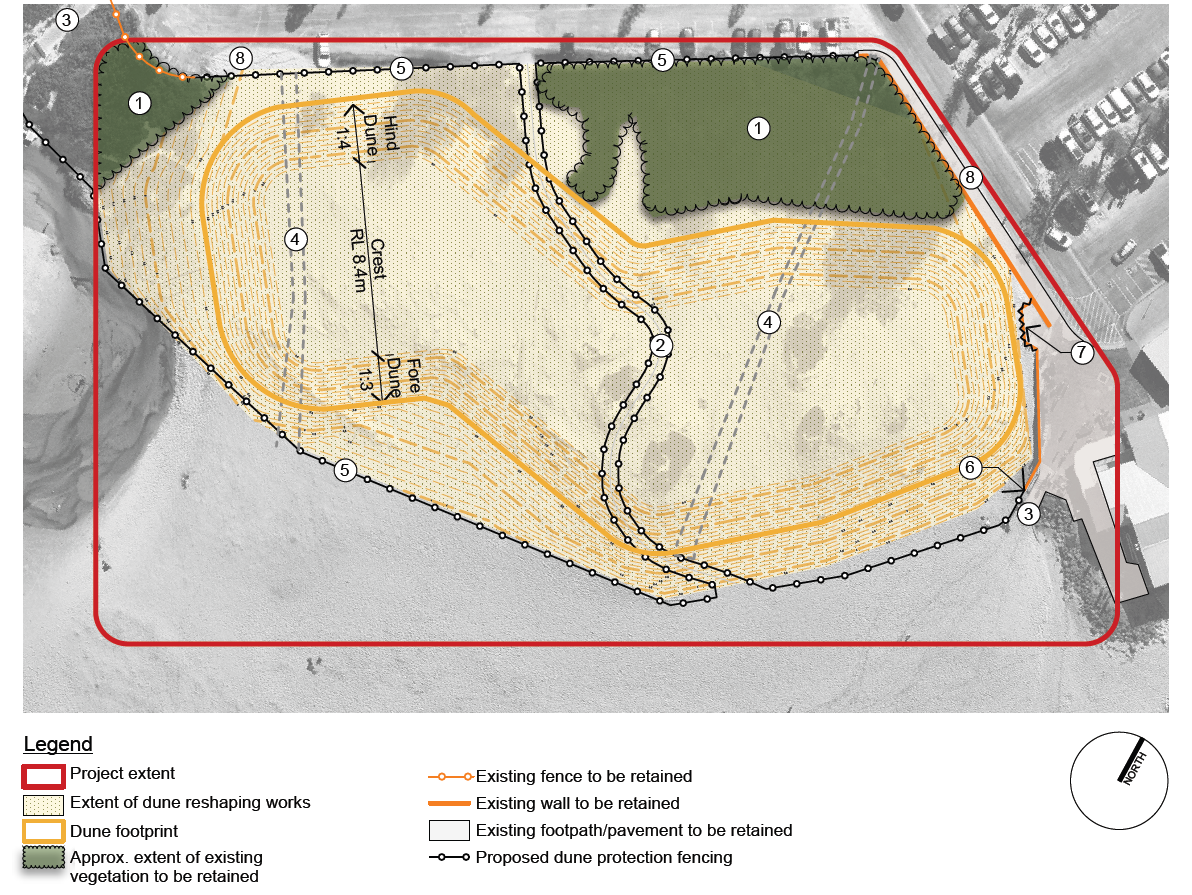 • reshaping the dune using earthmoving equipment to reduce its steepness and height (by up to 3m at the highest point) to improve stability
